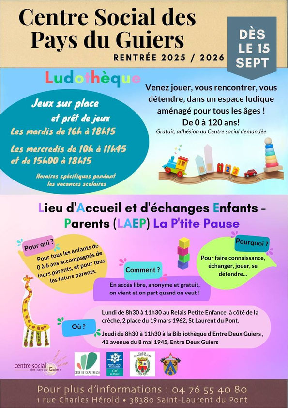 - Le lundi de 8h30 à 11h30 à St Laurent du Pont, au RPE (Relais Petite Enfance, derrière la crèche des Titounets)